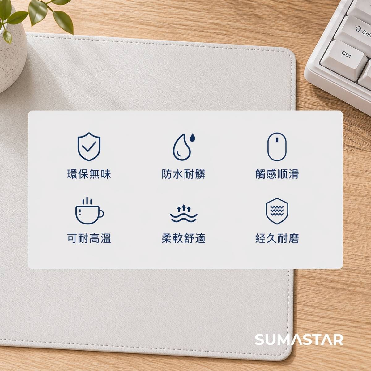 表面具備防水耐髒特性,日常飲品或灰塵不易造成清潔負擔。材質環保無味、柔軟舒適,並兼具耐高溫與經久耐磨的實用特色,適合長時間辦公與居家桌面使用。